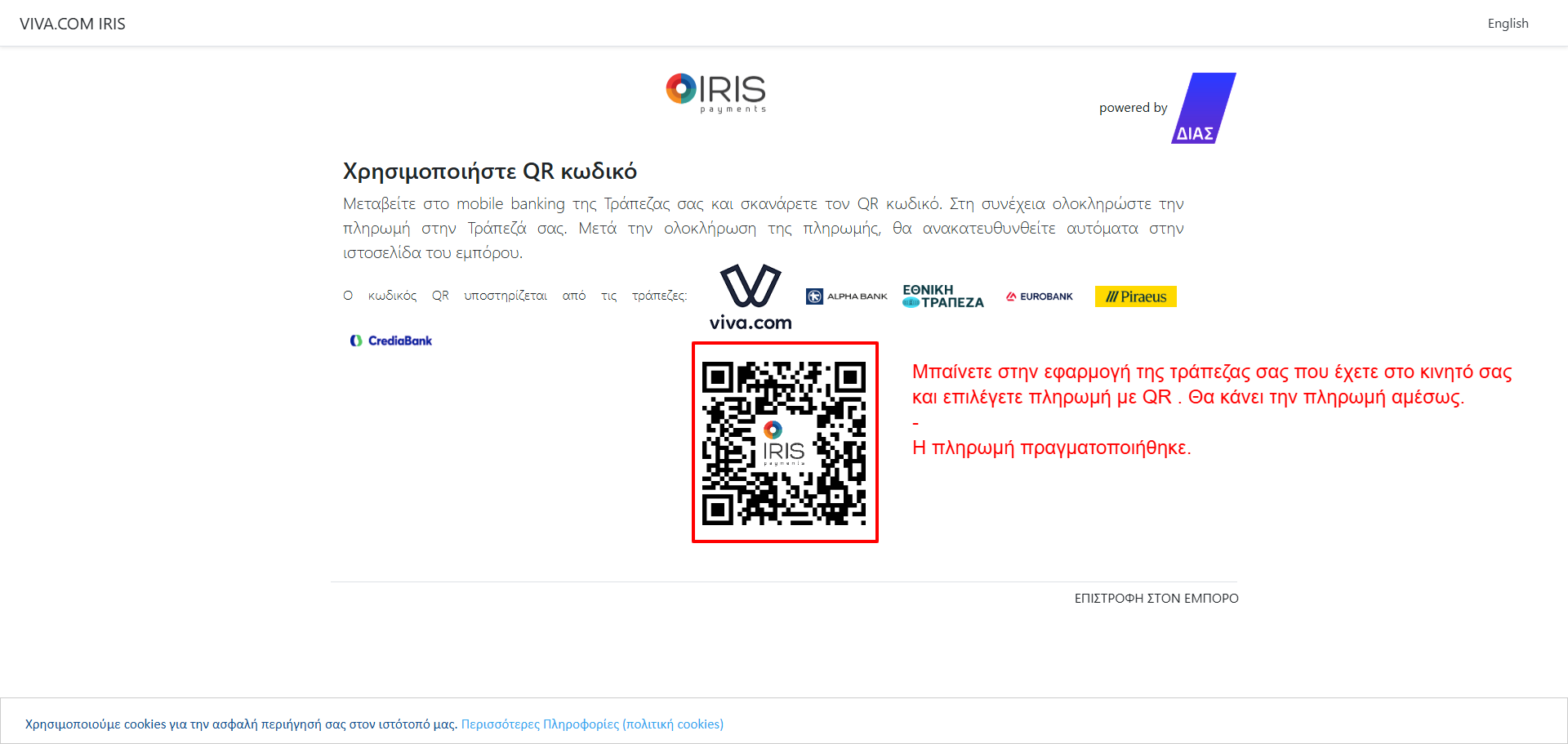 Θα ανοίξετε την εφαρμογή MOBILE-BANKING στο κινητό σας και μέσω της εφαρμογής θα σκανάρετε το QR που δημιουργήθηκε. θα πατήσετε πληρωμή.